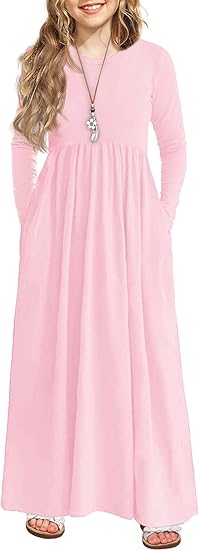 Girls Maxi Dress Long/Short Sleeve Casual Holiday Dress with Pockets for 5-13 Years