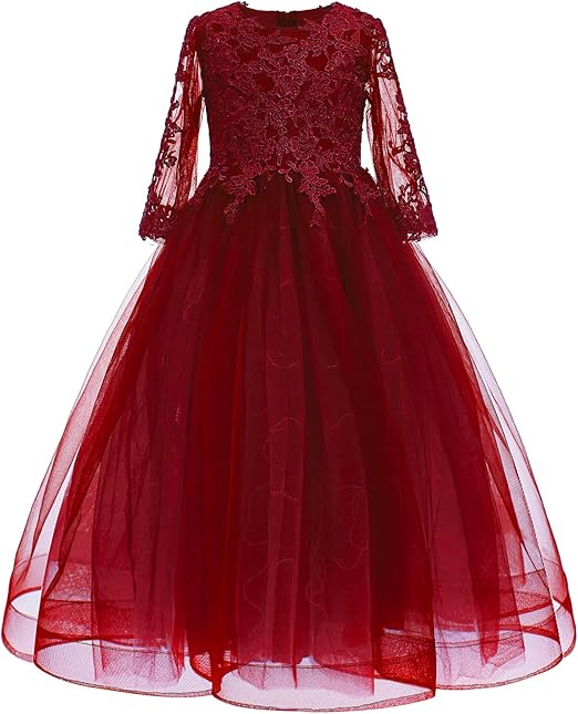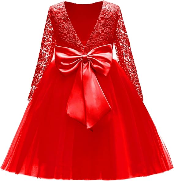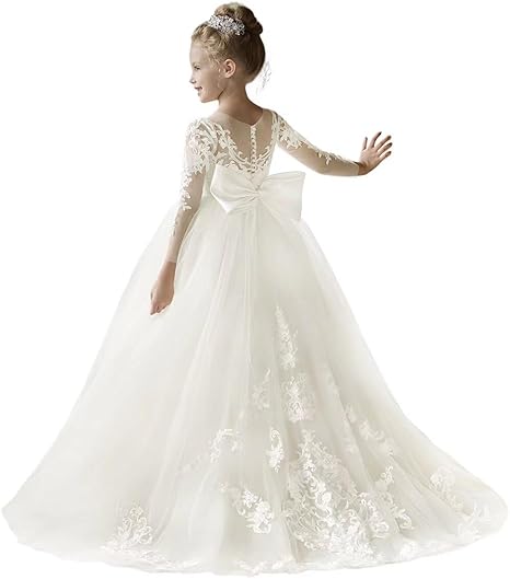 Lace Tulle Wedding Flower Girl Dress Long Sleeve Princess First Communion Dresses Pageant Tutu Dress with Bow Knot