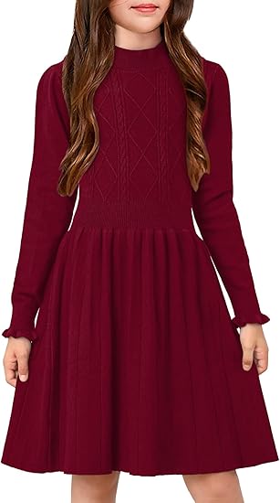 Girls Cable Knit Mock Neck Sweater Dress Fall Winter Long Sleeve Dresses 5-14 Years