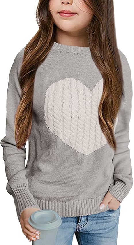 Girls' Pullover Sweaters Long Sleeve Cute Heart Pattern Crewneck Knit Jumper Tops
