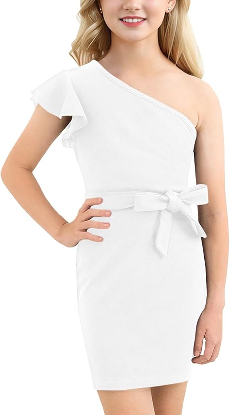 Girl's One Shoulder Ruffle Flounce Sleeve Party Birthday Dress with Belt 6-14 Years