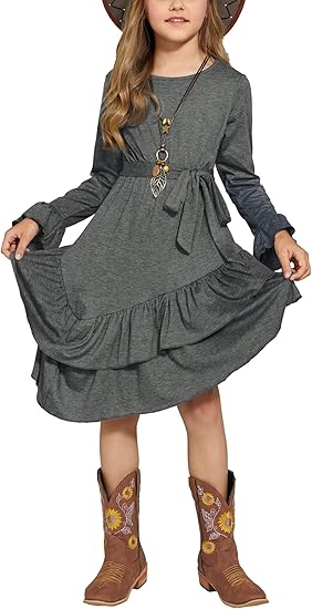 Girls Dresses Loose Plain Casual Ruffle Swing Midi Dress with Belt for 5-14 Years