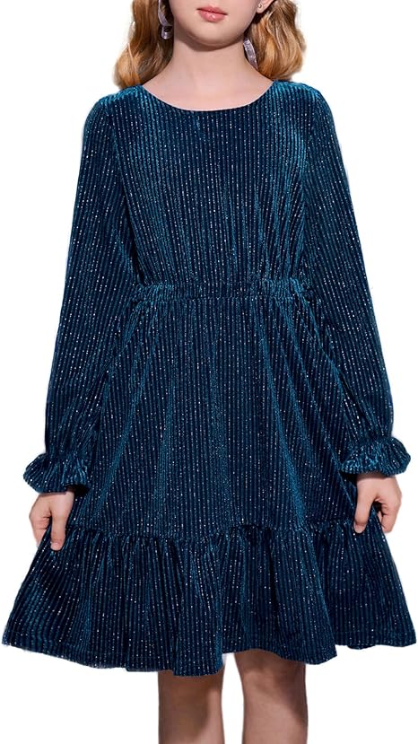 Girls Sparkle Velvet Dress Long Sleeve Party Fall Winter Dress Size 5-12