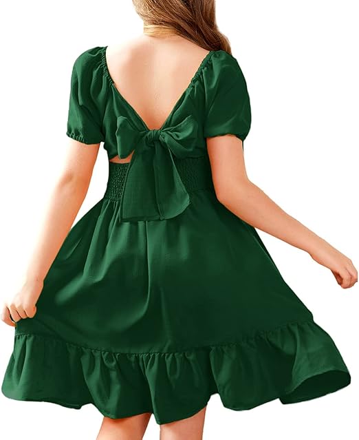 Girls Tie Back Short Sleeve Ruffle Hem Off Shoulder Casual Elegant Dresses 4-12 Years